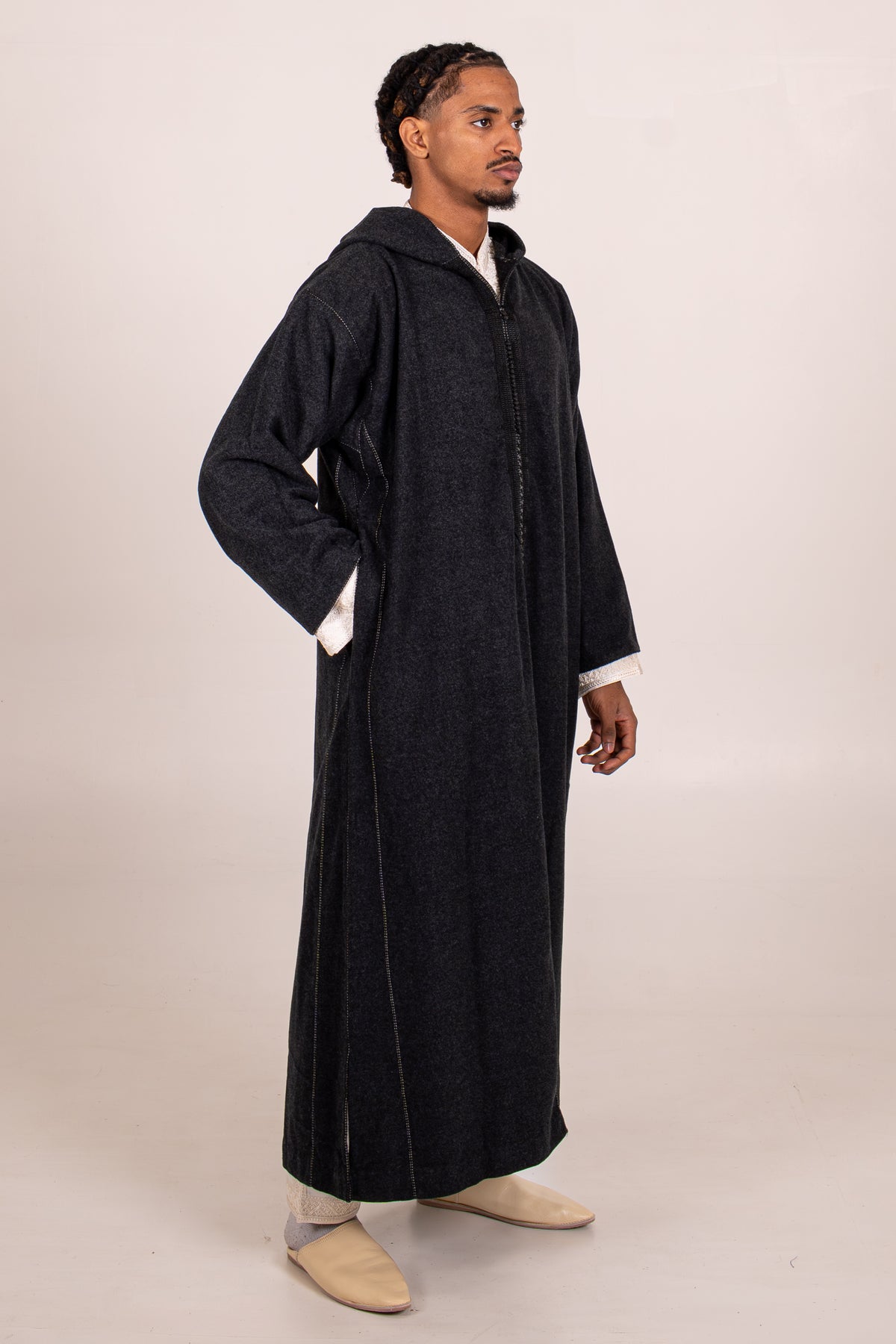 La couture semi-industrielle apporte une finition propre et une excellente durabilité. C’est l’équilibre idéal : un rendu soigné, et une tenue solide dans le temps, même si tu portes ta djellaba noire régulièrement.